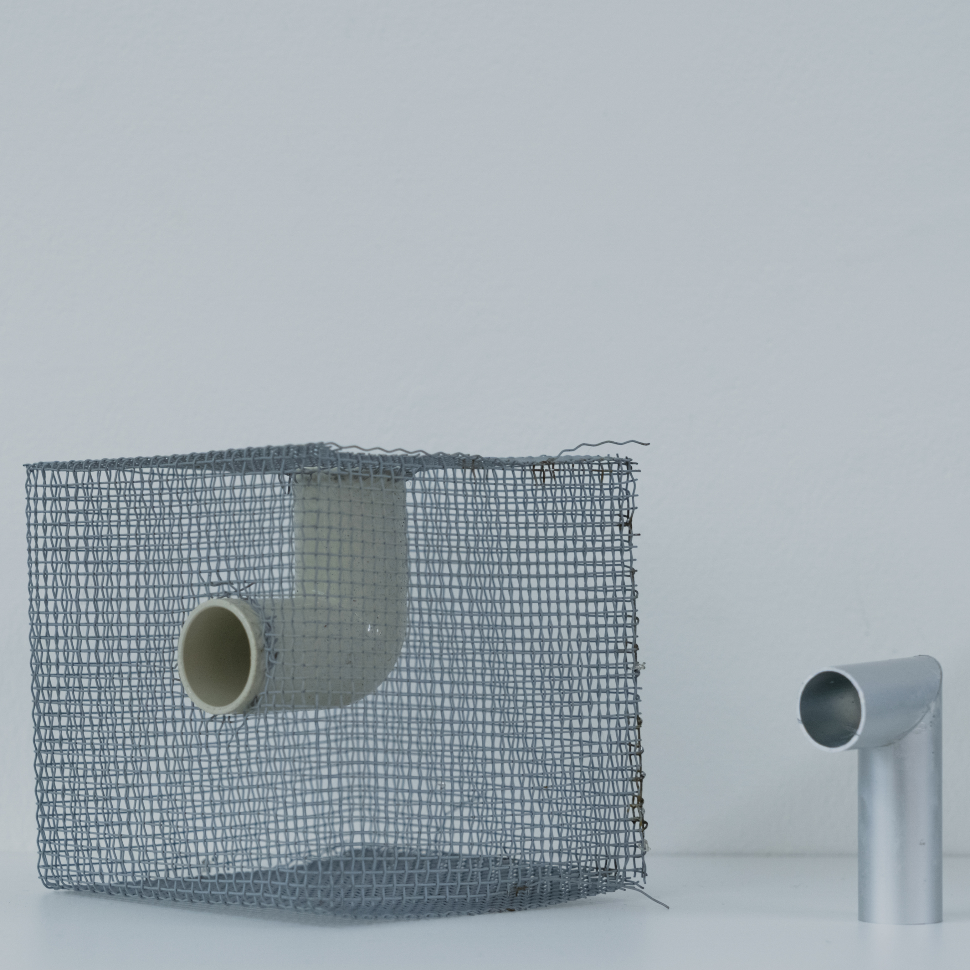 Punching Blockでは、その素材を箱状に組み上げ、内部を一本のL字パイプが貫通する構成としています。外側はひとつの塊として立ち上がりながら、内側の構造は完全には隠れず、距離や角度、光によって断片的に現れます。
