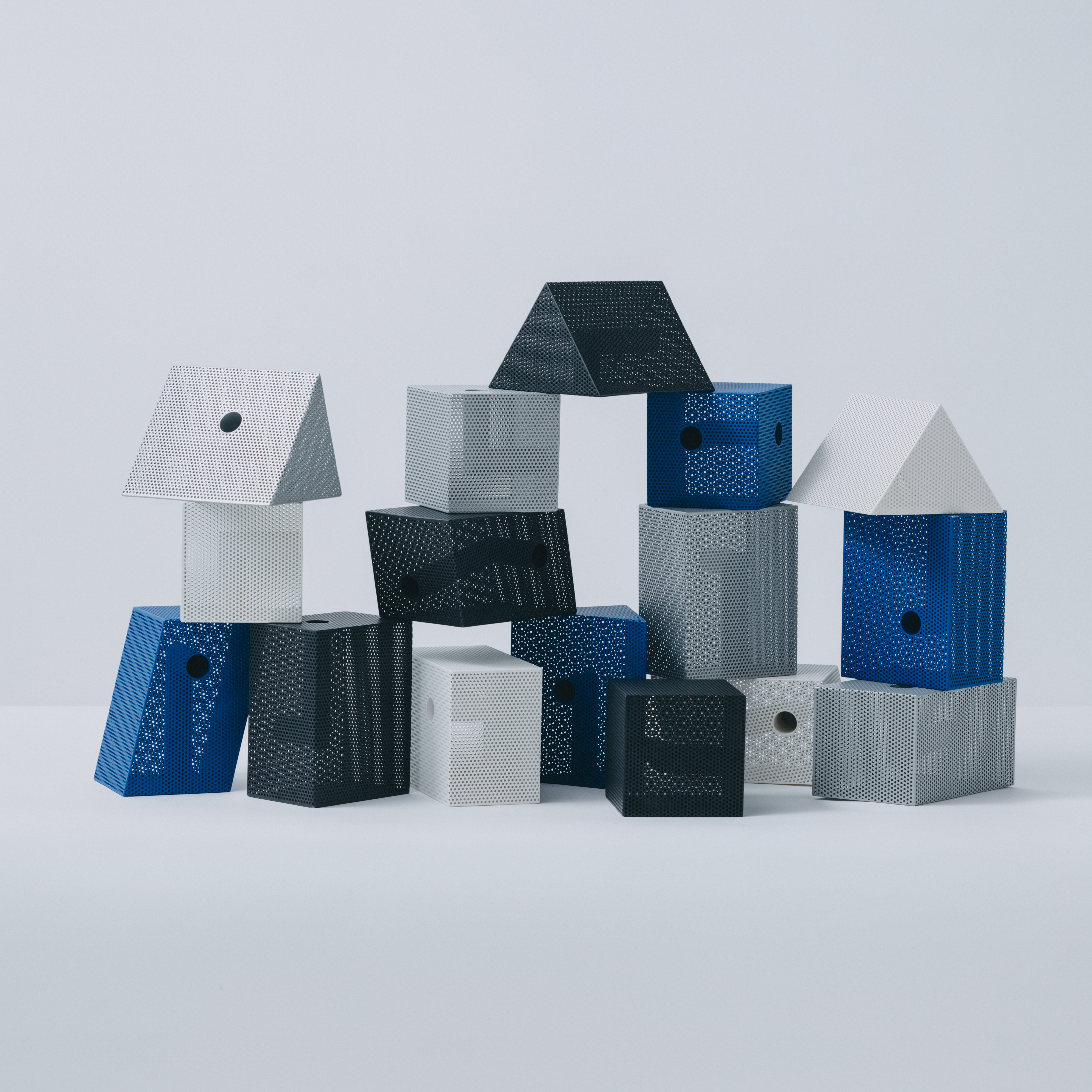 Punching Blockがつくるのは、機能そのものというより、置かれることによって生まれる見え方です。向きや位置、周囲との距離が変わることで、閉じた塊のように見えたり、内側に通った線がふと現れたりと、ひとつの立体の中に複数の印象が立ち上がります。