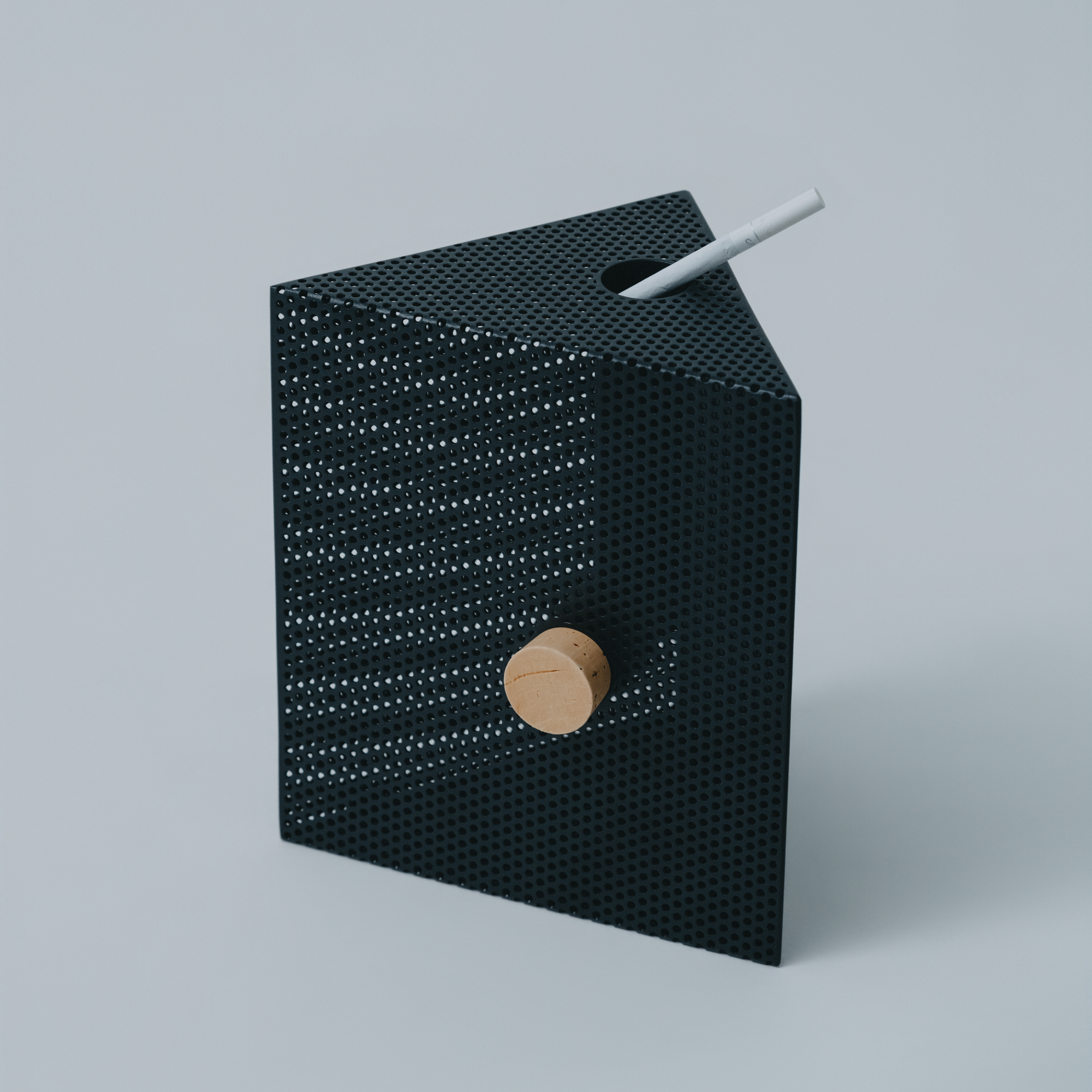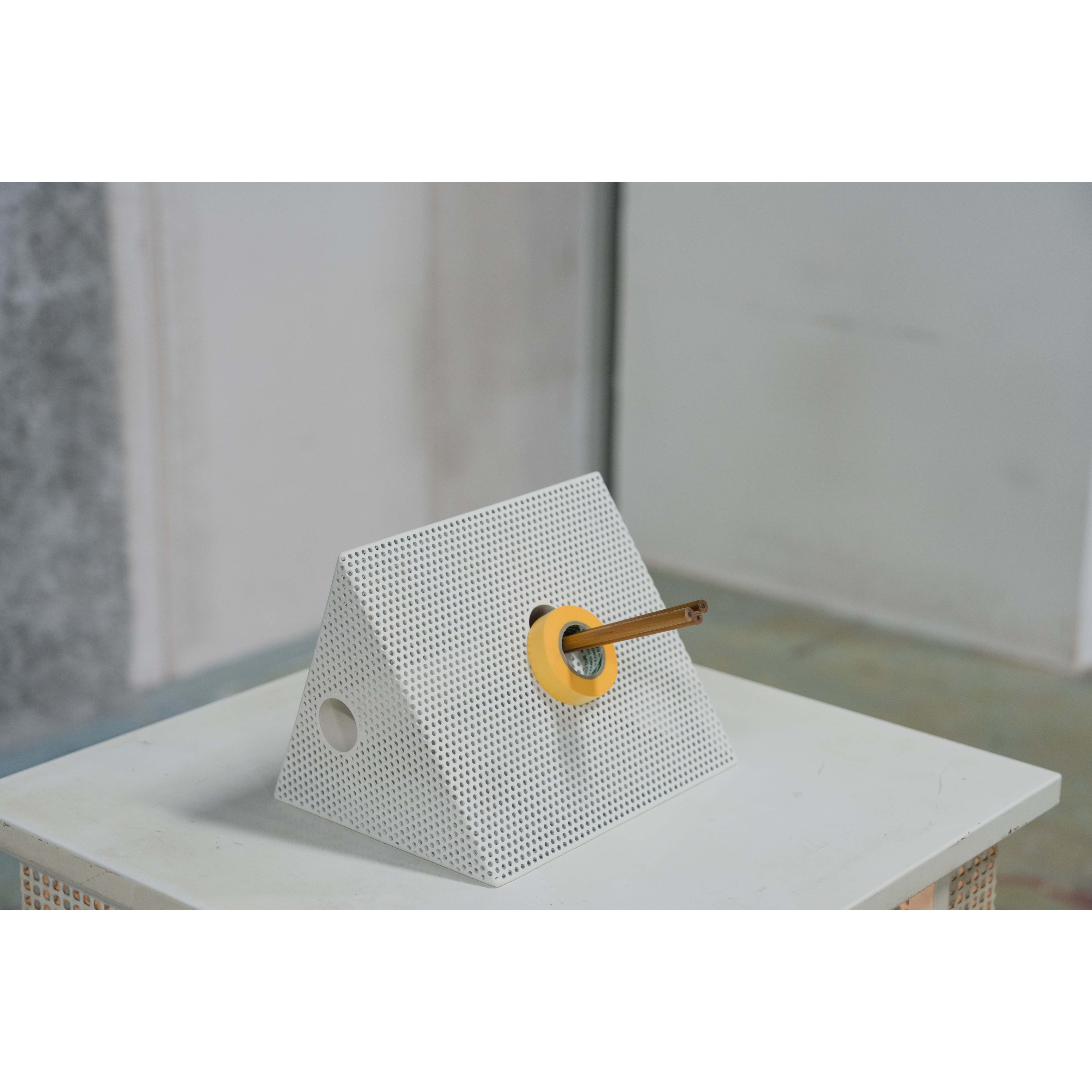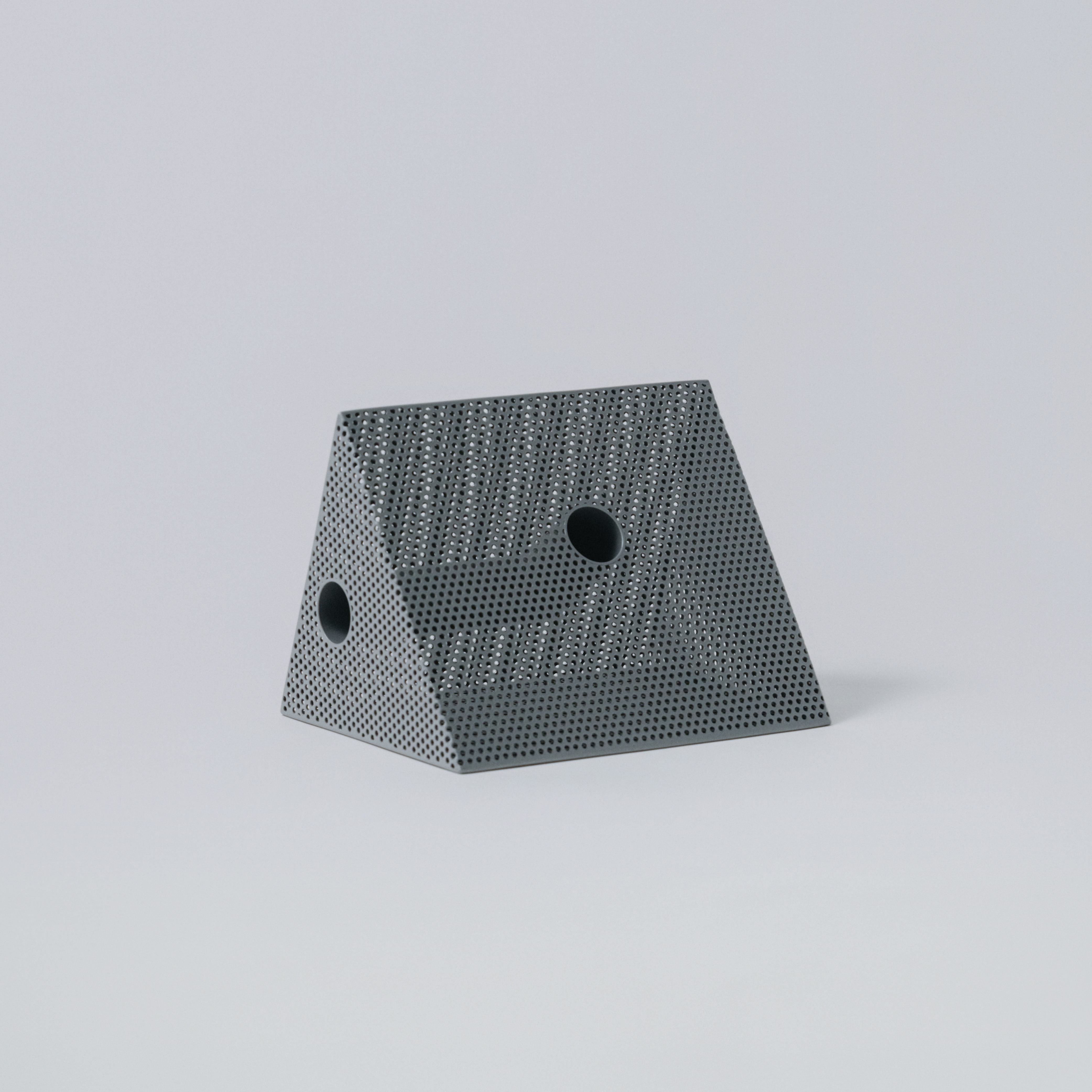 Punching Blockがつくるのは、機能そのものというより、置かれることによって生まれる見え方です。向きや位置、周囲との距離が変わることで、閉じた塊のように見えたり、内側に通った線がふと現れたりと、ひとつの立体の中に複数の印象が立ち上がります。
