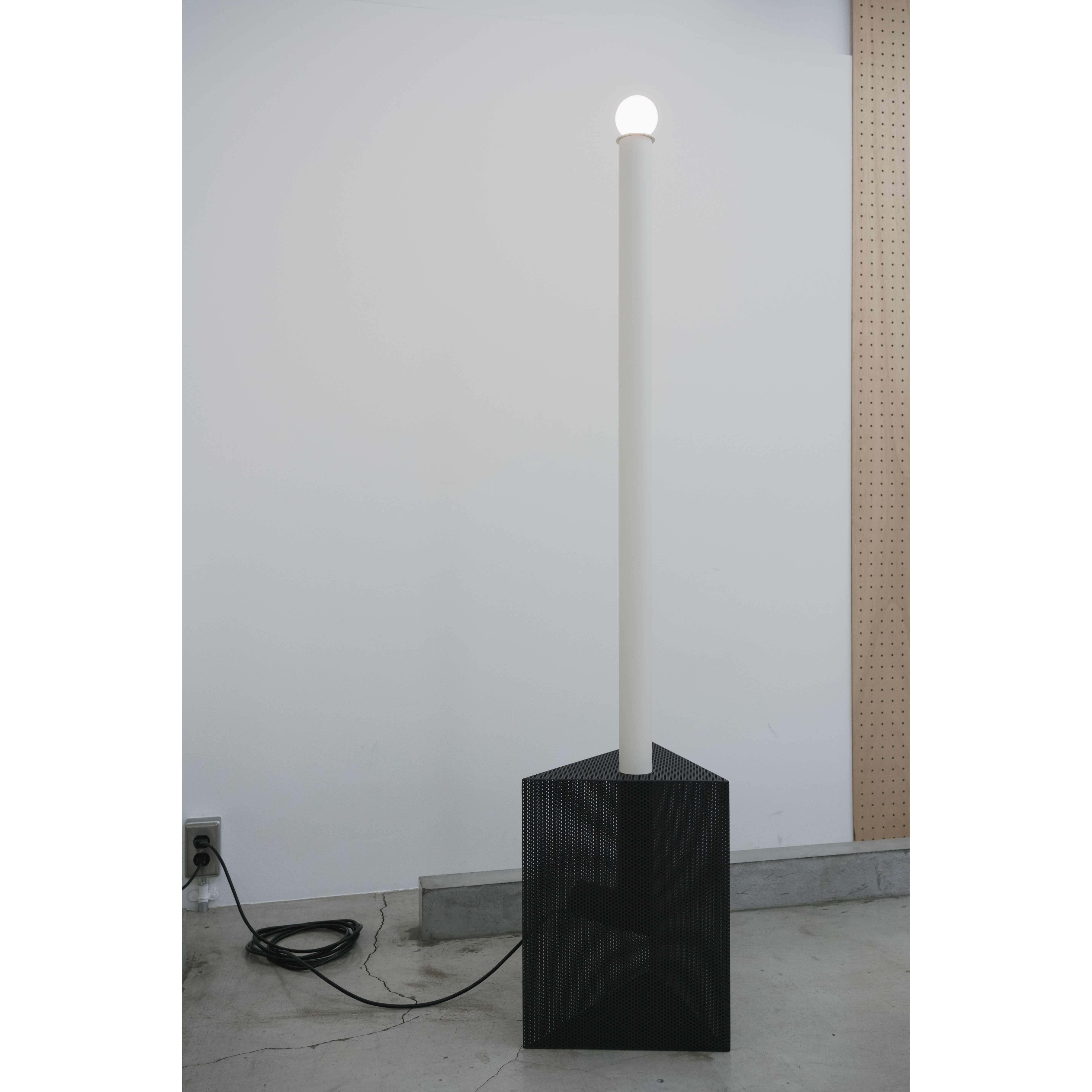 Punching Blockでは、その素材を箱状に組み上げ、内部を一本のL字パイプが貫通する構成としています。外側はひとつの塊として立ち上がりながら、内側の構造は完全には隠れず、距離や角度、光によって断片的に現れます。